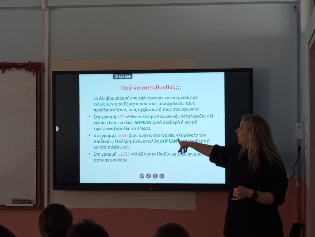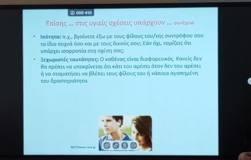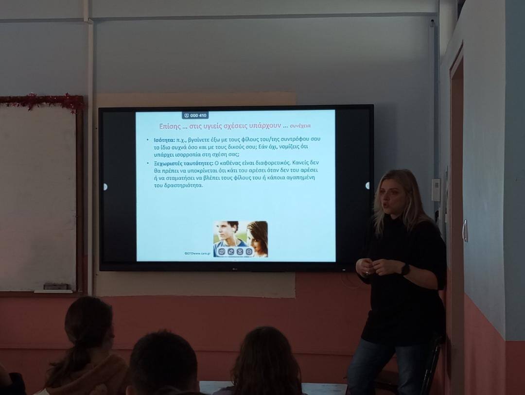 Στις 12 και 19 Φεβρουαρίου 2024 οι μαθητές και οι μαθήτριες της Α΄ και Β΄ τάξης του σχολείου μας ενημερώθηκαν από εξειδικευμένες Μαίες του Κέντρου Υγείας Αγίας Παρασκευής για θέματα που αφορούν τη σεξουαλική αγωγή και τις σχέσεις στη εφηβεία.