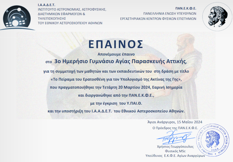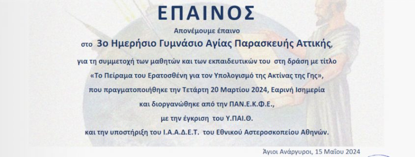 Έπαινος για τη συμμετοχή του σχολείου μας στο «Πείραμα του Ερατοσθένη» Ιούνιος 6, 2024/σε Δραστηριότητες, Νέα & Ανακοινώσεις /από 3ο Γυμνάσιο Αγίας ΠαρασκευήςΈπαινος για τη συμμετοχή του σχολείου μας στο «Πείραμα του Ερατοσθένη».