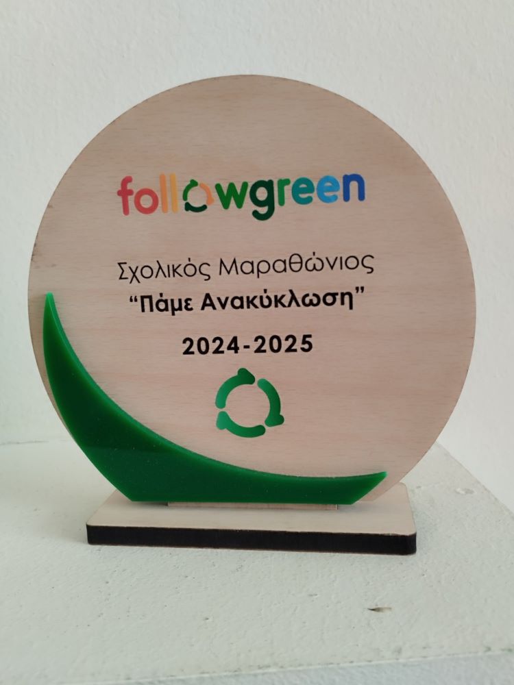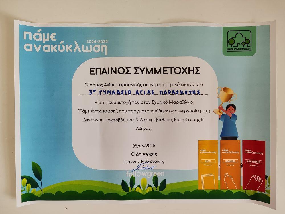 Το σχολείο μας συμμετείχε φέτος στον Σχολικό Μαραθώνιο «Πάμε Ανακύκλωση» που διοργάνωσε ο Δήμος Αγίας Παρασκευής και κατέλαβε την 1η θέση, για την οποία βραβεύτηκε σε ειδική εκδήλωση την Πέμπτη 5 Ιουνίου 2025. Οι μαθητές/τριες κατά τη διάρκεια της σχολικής χρονιάς ανακύκλωσαν σε ειδικούς κάδους χαρτί, γυαλί και πλαστικό. Ουσιαστική ήταν η συνεργασία των οικογενειών τους και φυσικά των εκπαιδευτικών του σχολείου μας.