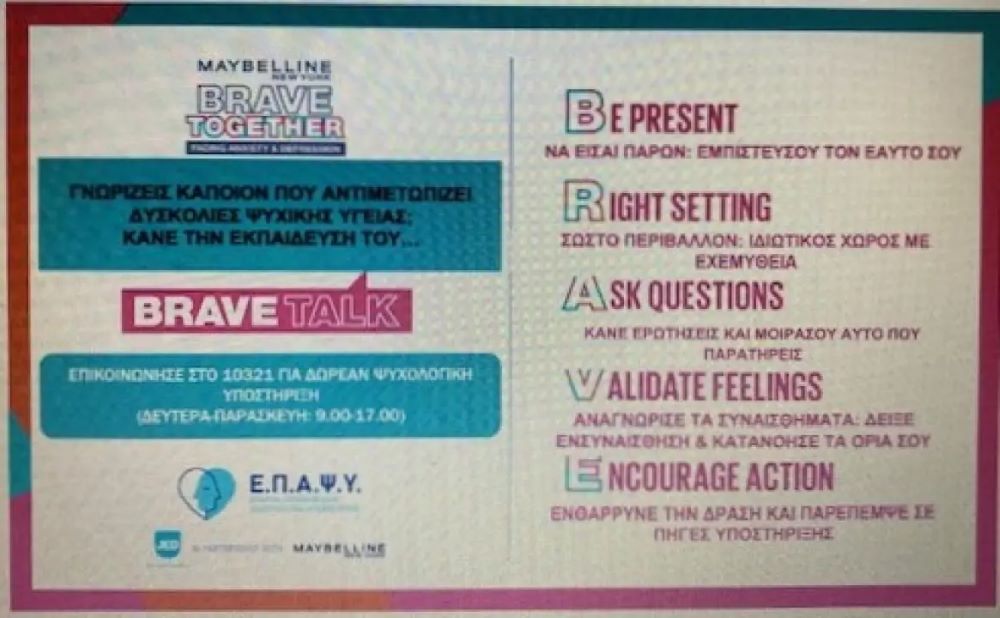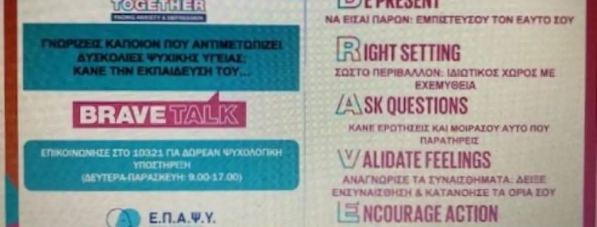 Την Παρασκευή 17 Οκτωβρίου 2025 οι εκπαιδευτικοί του σχολείου μας συμμετείχαν σε διαδικτυακή επιμόρφωση που διοργάνωσε η Εταιρεία Περιφερειακής Ανάπτυξης και Ψυχικής Υγείας (ΕΠΑΨΥ), με τίτλο BRAVE TALK στο πλαίσιο της Καμπάνιας BRAVE TOGETHER. Πρόκειται για παγκόσμια πρωτοβουλία με στόχο την υποστήριξη όλων όσοι αντιμετωπίζουν δυσκολίες που σχετίζονται με το άγχος και την κατάθλιψη.